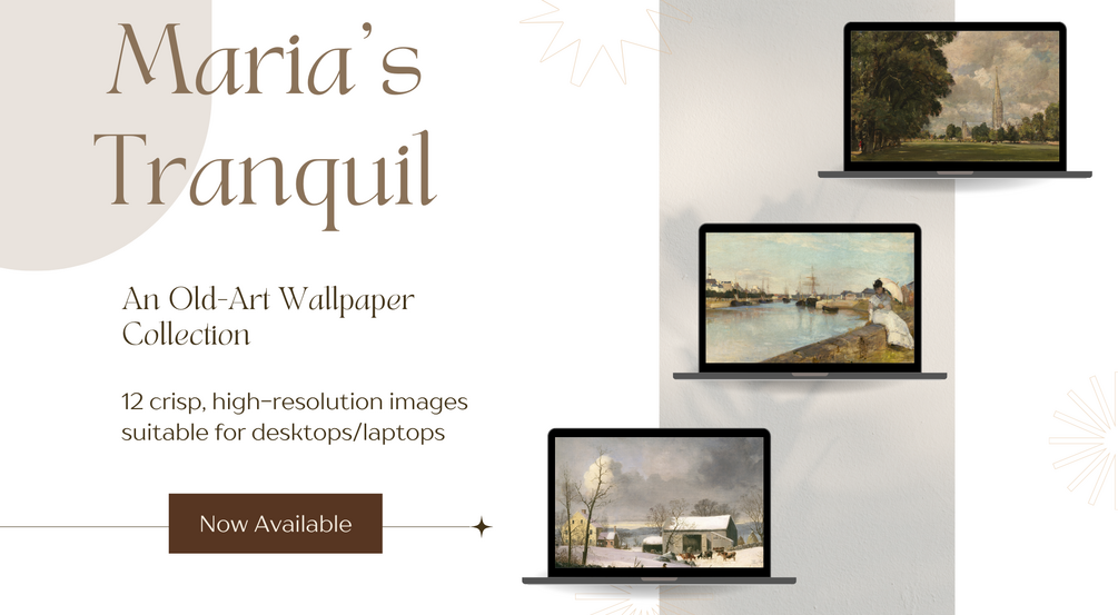 Meet Maria’s Tranquil - Wallpaper Collection. This set offers 12 classic art wallpapers that are high-resolution and ready to use on any laptop or desktop. You can even change your wallpaper each month if you’d like to keep things fresh all year long!